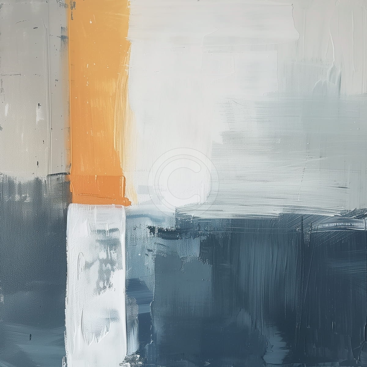 Dieses Bild vermittelt ein Gefühl von Gleichgewicht und Frische mit einer klaren, aber fließenden Komposition. Der Kontrast von kühlen Blau- und Grautönen mit einem warmen Gold zeigt Licht, das aus der Dunkelheit hervorkommt. Die sichtbaren und ausdrucksstarken Pinselstriche geben Struktur und Bewegung und verbinden Ordnung mit Freiheit. Die einfachen geometrischen Formen verleihen dem Werk eine moderne und ruhige Stimmung, sodass der Betrachter den Übergang von Dunkelheit zu Licht selbst erleben kann.