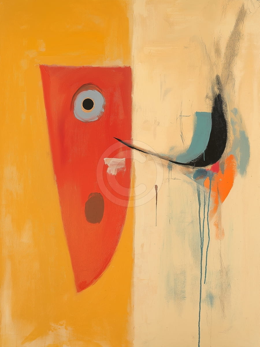 Dieses abstrakte Gemälde zeigt ein Gefühl von Bedeutung und Geheimnis. Es nutzt klare geometrische Formen und deutliche Pinselstriche, um Interesse zu wecken. Der starke Kontrast zwischen warmen Gelb- und Rottönen auf der einen Seite und kühleren Blau- und Schwarztönen auf der anderen Seite schafft eine visuelle Spannung, als ob zwei Seiten einander gegenüberstehen. Die Form, die an ein Auge erinnert, und die klaren Linien lassen an eine versteckte Botschaft denken, sodass der Betrachter selbst entscheiden kann, was sie bedeutet. Dieses Kunstwerk steht für den abstrakten Stil und lädt dazu ein, über das Sehen, über Zeichen und über tiefere Gedanken nachzudenken.