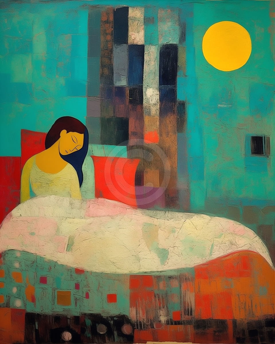 Dieses schöne Gemälde zeigt eine Frau, die ruhig unter dem Licht eines strahlend gelben Mondes liegt. Die geometrischen Formen und strukturierten Flächen verbinden Abstraktion und Wärme und erzeugen ein Gefühl von Ruhe und Nachdenklichkeit. Das kühle Türkis des Himmels kontrastiert mit den warmen Rot- und Orangetönen der Bettwäsche und des Hintergrunds, was ein harmonisches Gleichgewicht schafft. Der Mond, Symbol für Träume und Gefühle, beleuchtet die Szene sanft und verstärkt die meditative, poetische Stimmung des Werkes.