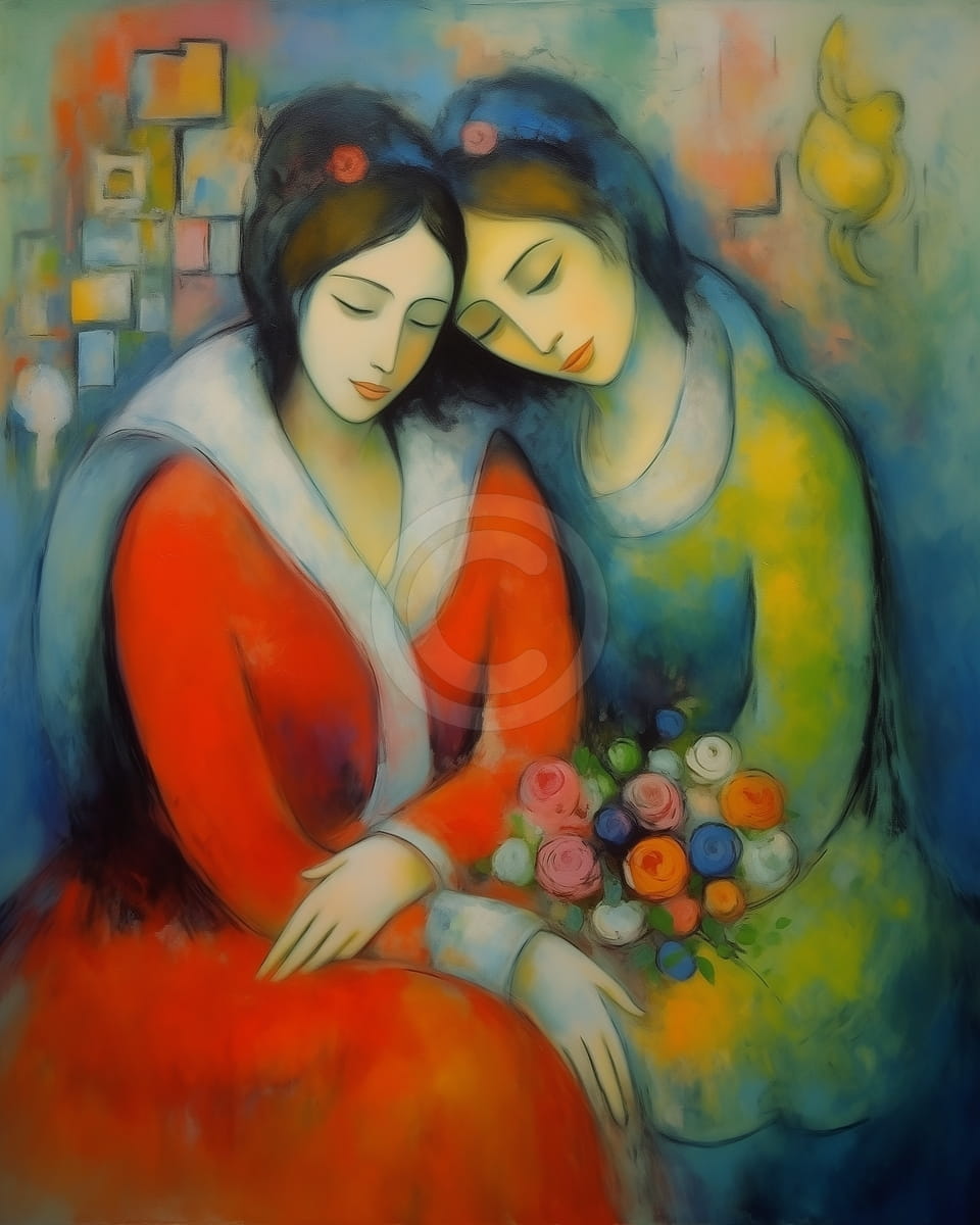 Dieses schöne Gemälde zeigt zwei Schwestern, die durch eine liebevolle, enge Bindung verbunden sind. Ihre Nähe vermittelt Wärme und Zuneigung. Die weichen Pinselstriche und die harmonischen Farben in Rot, Blau und Grün schaffen eine träumerische, nostalgische Stimmung. Eine Schwester legt sanft den Kopf auf die Schulter der anderen, was Vertrauen und Liebe ausdrückt. Der bunte Blumenstrauß in ihren Händen symbolisiert gemeinsame Erinnerungen, Wachstum und die starke Verbindung zwischen ihnen. Der abstrakte Hintergrund verstärkt Ruhe und Zeitlosigkeit, wodurch das Werk eine klare poetische Feier der Schwesternschaft wird.
