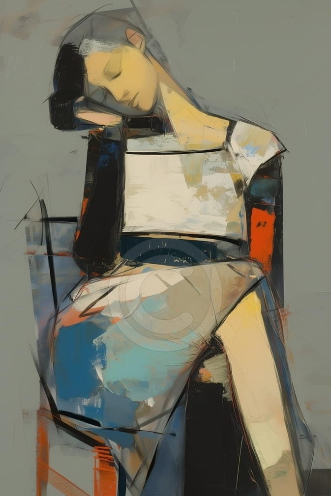 Dieses Gemälde zeigt eine Frau, die sich müde an einen Stuhl lehnt und einen stillen Moment der Ruhe erlebt. Die kantige Anordnung und die zurückhaltenden Farben in Grau, Blau und Erdtönen schaffen eine nachdenkliche und einsame Stimmung. Die Pinselstriche sind locker und zugleich ausdrucksstark, was der Szene eine leicht traumhafte Wirkung gibt. Die Figur wirkt gleichzeitig fest verankert und dennoch leicht. Der feine Gegensatz zwischen klaren Linien und weichen Schatten bringt zusätzliche Tiefe. Insgesamt vermittelt das Bild Ruhe, Selbstbetrachtung und ein stilles Loslassen.