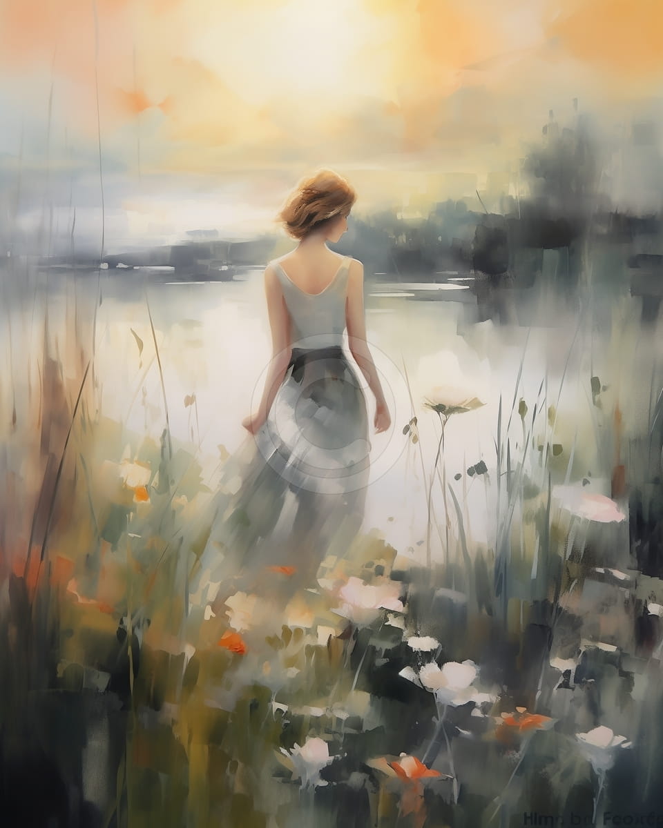 Dieses beruhigende Gemälde zeigt eine junge Frau am Ufer eines stillen Sees im warmen Licht des Sonnenuntergangs. Ihre Figur, umgeben von weichen Wildblumen, wirkt ruhig und nachdenklich, während sie auf das glitzernde Wasser schaut. Das sanfte Licht und die weichen, leicht verschwommenen Pinselstriche schaffen eine ruhige, etwas träumerische Stimmung, in der Natur und Gefühl zusammenkommen. Das Kunstwerk zeigt Themen wie Einsamkeit, Nachdenken und die Ruhe, die man in der Natur finden kann.