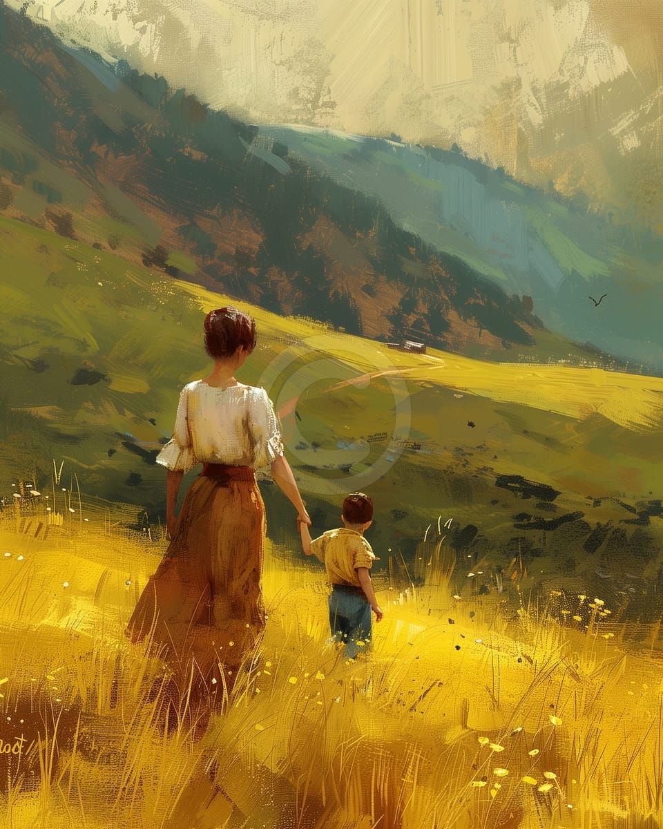 Dieses Bild zeigt einen liebevollen Moment zwischen einer Mutter und ihrem Kind, die Hand in Hand durch eine goldene Wiese in den Schweizer Alpen gehen. Die warmen Farben des Feldes stehen im Kontrast zu den grünen und blauen Tönen der fernen Berge und schaffen eine ruhige Szene. Das Sonnenlicht legt einen weichen Glanz über die Landschaft. Das Bild wirkt still und voller einfacher Gefühle. Es zeigt eine enge Verbindung zur Natur, zur Familie und zur schlichten Schönheit des Lebens auf dem Land.