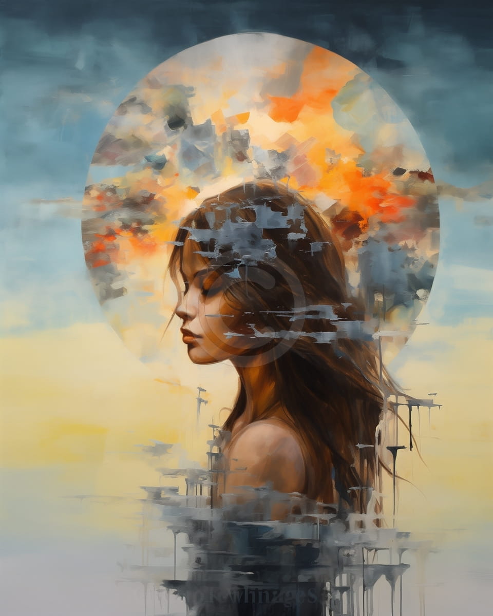 Dieses faszinierende Kunstwerk verbindet Surrealismus und Abstraktion und zeigt eine Szene wie in einem Traum. Eine ruhige Frau scheint sich teilweise in der leichten Atmosphäre um sie herum aufzulösen, als würde sie mit dem Raum eins werden. Ein heller Mond hinter ihrem Kopf gibt warmes Licht und erinnert an Gedanken und das innere Erleben. Der Kontrast zwischen Licht und Dunkel, mit goldenen Farben, die in tiefes Blau übergehen, schafft eine geheimnisvolle Stimmung. Die Farben fließen weich ineinander. Das Bild wirkt still, tief und voller Vorstellungskraft.