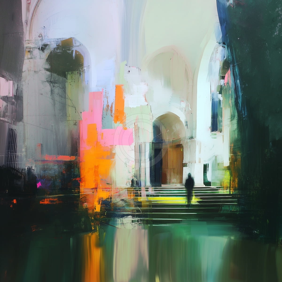 A single person stands at the bottom of wide steps inside a large hall that looks like a cathedral. Tall arches and soft, pale light make the space feel open and calm. The clear lines of the building mix with strong abstract strokes of orange, pink, and dark green, giving the scene a bright and unusual look. Gentle light spreads across the area, softening the details and blending the real space with the painted forms. The overall mood is quiet and thoughtful, inviting the viewer to stop and look more closely.