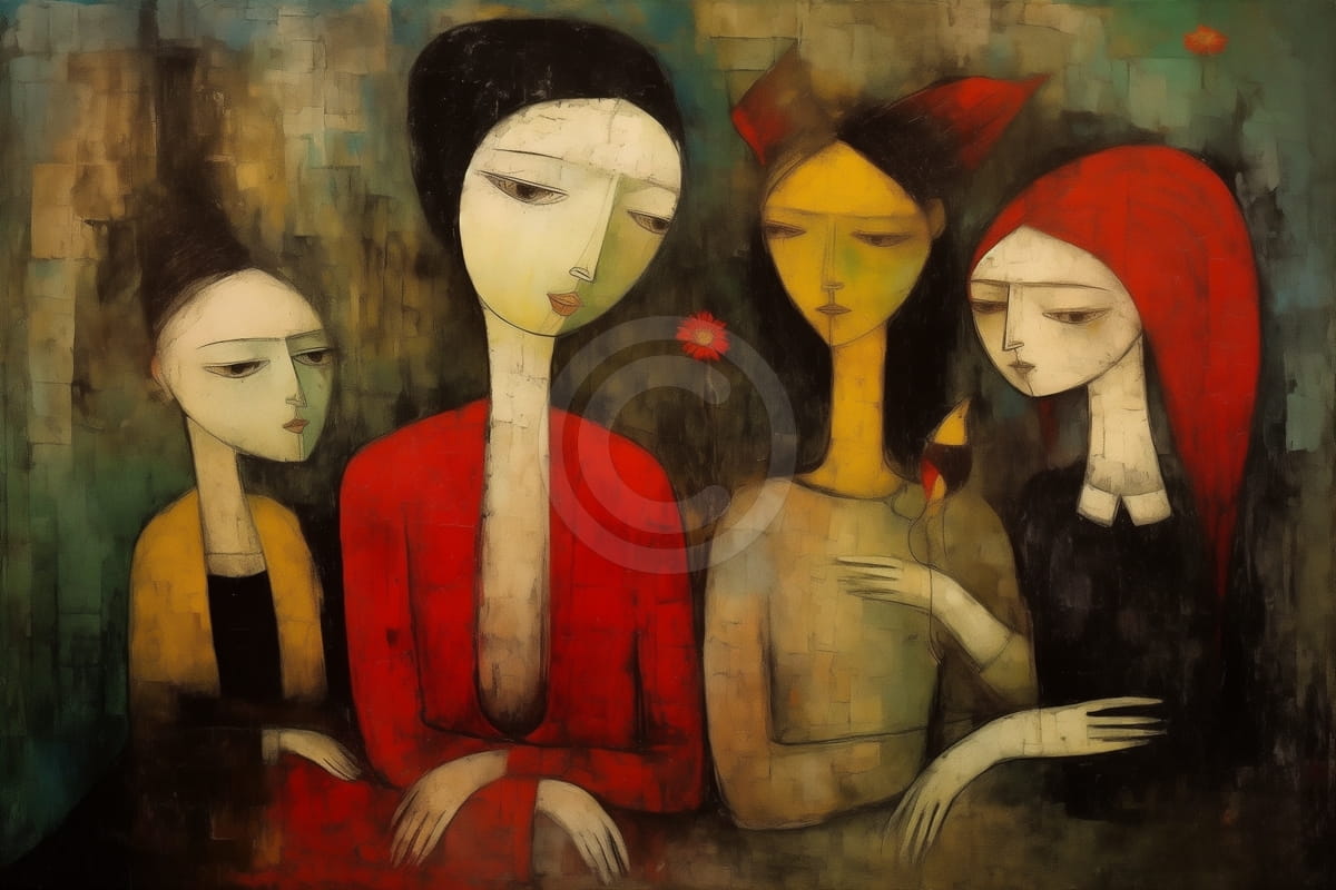 This painting shows four women sitting close together, showing a strong feeling of friendship. Their long, simple forms and calm faces show quiet understanding and deep emotion. The soft greens, dark reds, and warm earth colors create a close and thoughtful mood. Their hands touch and their gentle poses show trust, unity, and support. The image feels like a simple and touching tribute to friendship.