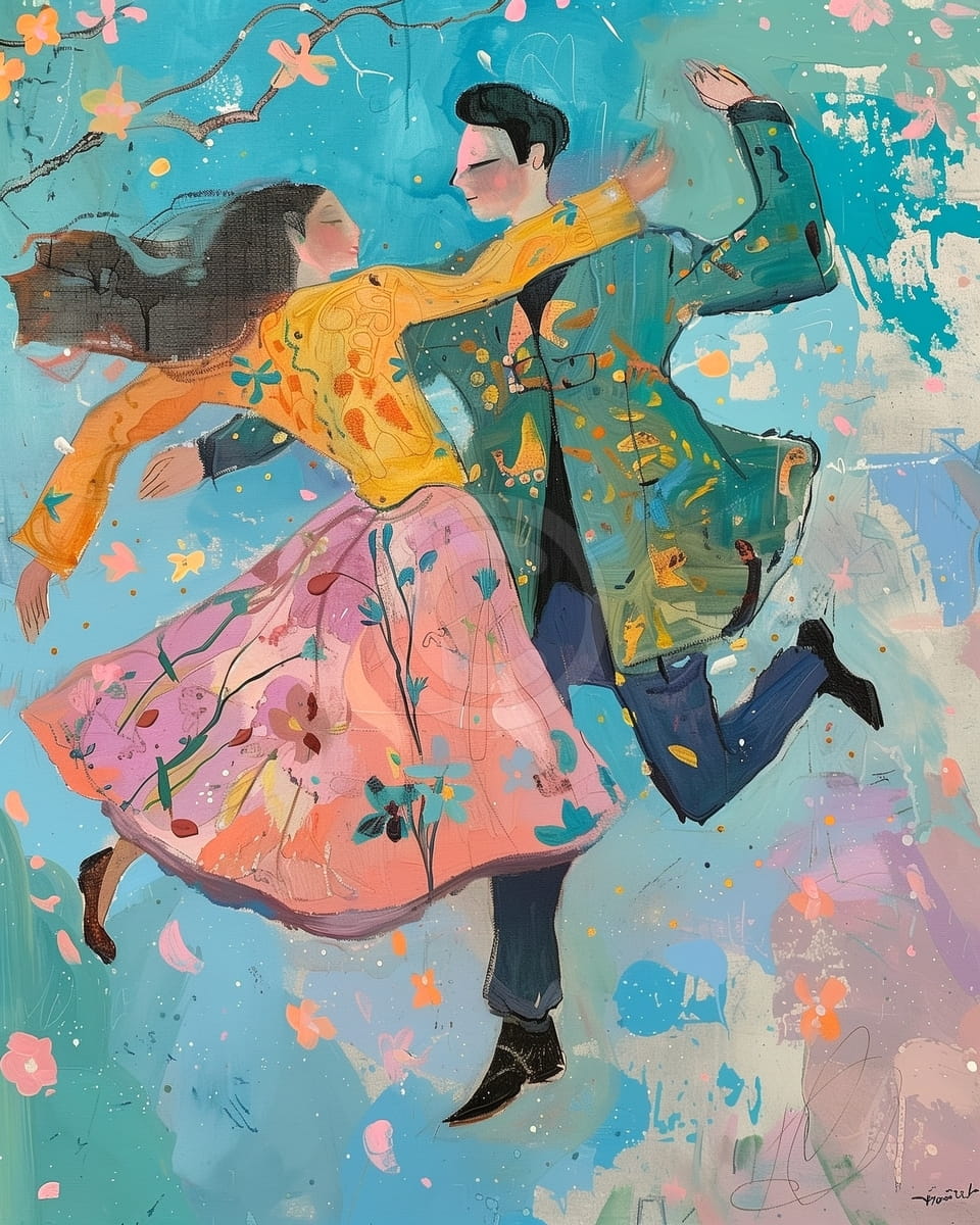 This painting shows a couple dancing together in a joyful, harmonious embrace. The flowing dress with floral patterns and vibrant, textured brushstrokes convey energy and romance. Their abstract faces express happiness and connection, while the dreamy background with soft blossoms and bright colors adds to the whimsical, lively atmosphere.