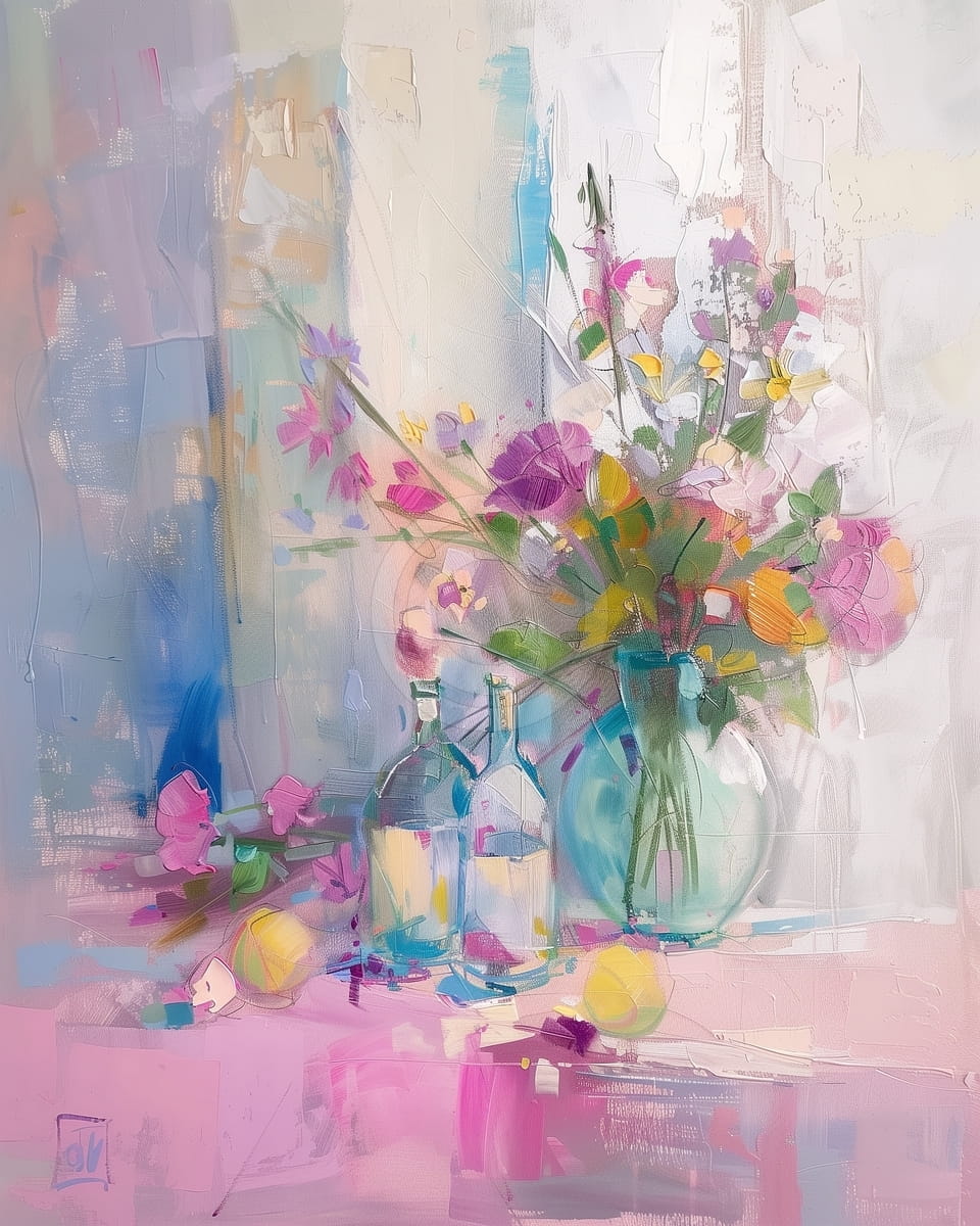 This painting shows a colorful still life with a bouquet of delicate flowers in a glass vase, placed near fresh fruits and bottles on a softly textured surface. The pastel colors, such as pink, blue, and yellow, mix smoothly and create a light and pleasant atmosphere. The visible brushstrokes add depth and make the scene feel more natural and lively. The light helps show the transparency of the glass and makes the whole image look bright and clear. The overall scene gives a calm and elegant feeling.