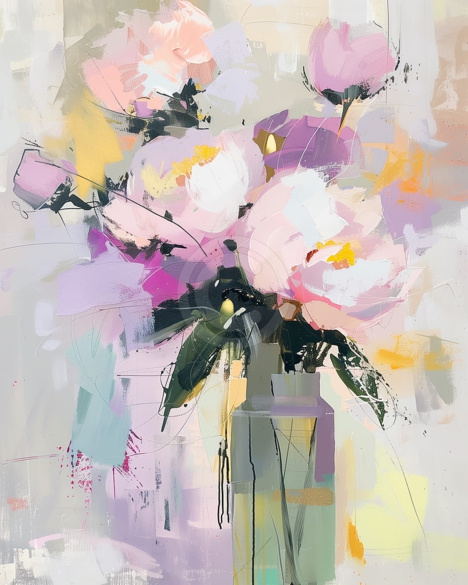 This abstract painting of peonies mixes soft and expressive brushstrokes with bright spots of color. The pink and white petals are clearly visible on a pastel background with touches of violet, yellow, and green. The vase gives the composition stability and contrasts with the free flowers. Light and shadow, along with the layers of paint, create depth and movement, making the painting feel calm and full of life at the same time.