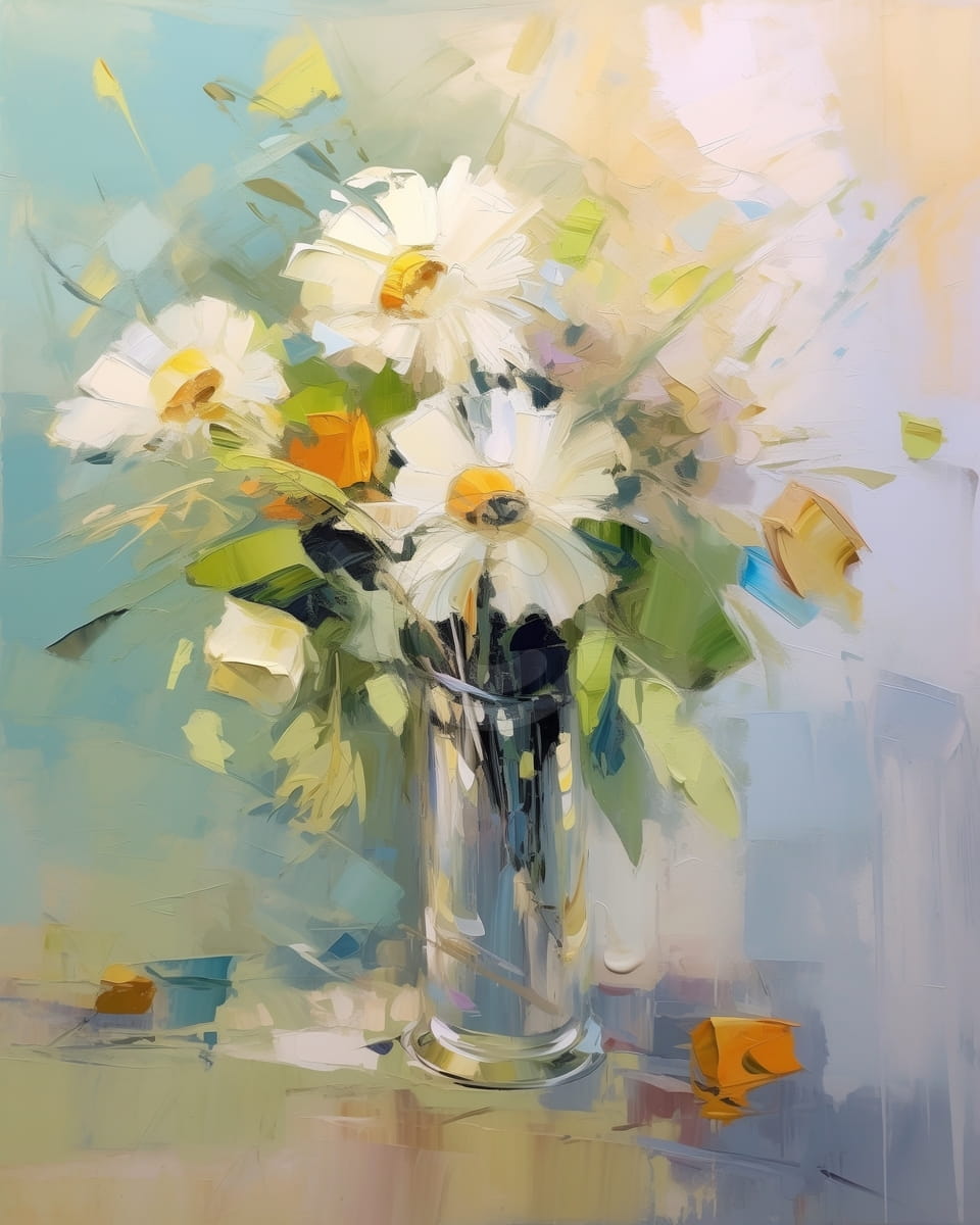 This pastel still life with flowers gives a feeling of softness and calm. The white petals of the daisies stand out against the rich green leaves, placed in a tall glass vase that reflects light. The visible brushstrokes and impressionist style add gentle movement while keeping the scene peaceful. The soft pastel colors in the background blend smoothly together. They give the painting a light and airy look. The overall image feels quiet and simple.