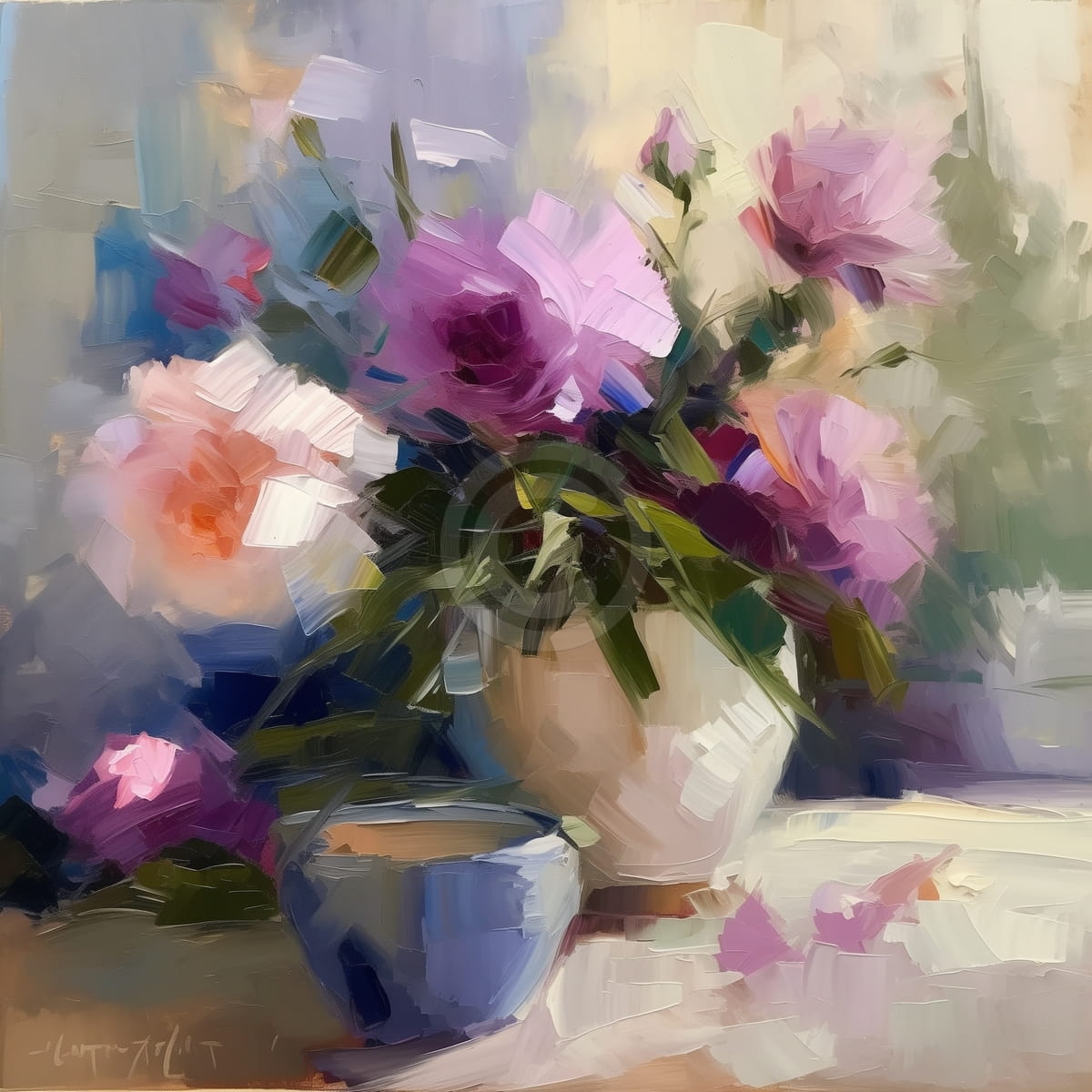 This painting shows an abstract but clear view of peonies, highlighting their soft beauty with strong brushstrokes and rich colors. Pink, purple, and light peach flowers stand out against a calm, muted background, creating a nice balance between gentle tones and brighter energy. The textured, impressionist style makes the flowers seem slightly alive, as if they are moving softly in the light. A simple ceramic vase holds the bouquet, while a blue bowl nearby adds depth and balance. The overall scene feels natural, fresh, and full of simple elegance.