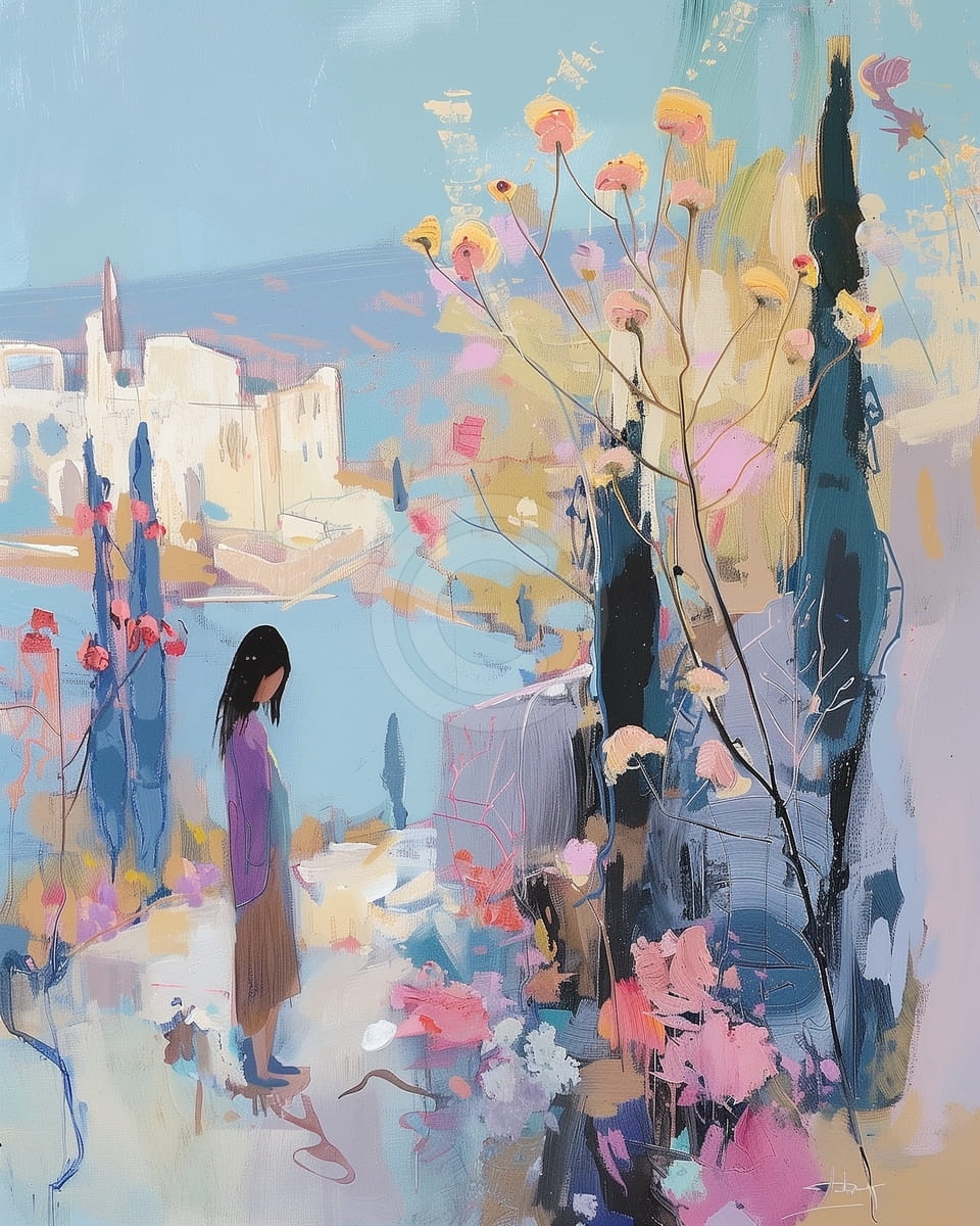 This artwork shows a thoughtful young girl standing in a soft, floral landscape with an abstract impressionist style. Soft pastel colors mix with some brighter accents to create a gentle and slightly unreal atmosphere. The delicate and visible brushstrokes help the scene feel calm and balanced. The smooth composition suggests quiet reflection and peace. Overall, the artwork invites the viewer to enjoy the calm beauty of the scene.
