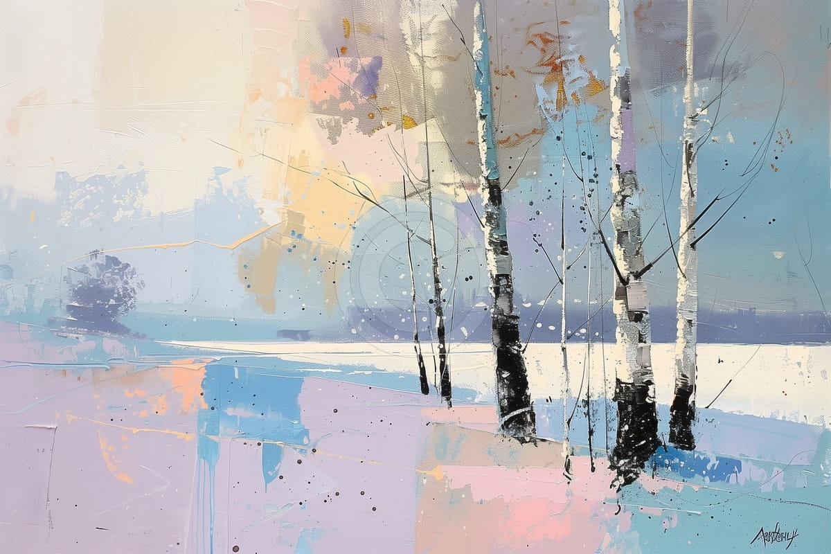 This painting shows a winter birch forest in soft, calm colors. The thin white trunks stand clearly against a gentle abstract background of blues, purples, and warm golden tones. The artist uses visible brushstrokes and light touches of paint to suggest movement. The scene feels quiet and peaceful, yet full of life and color. It is a decorative piece that can fit well in many interior spaces.