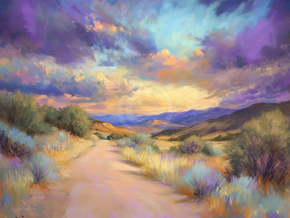 This painting shows an American desert at sunset, with a winding dirt path passing through dry land, wild shrubs, and gentle hills. The sky mixes purple, blue, orange, and gold, creating a dramatic and impressive view. Light and shadow add depth, making the landscape feel wide and timeless. The artist’s visible brushstrokes give the desert warmth, inviting the viewer into a calm but powerful scene.
