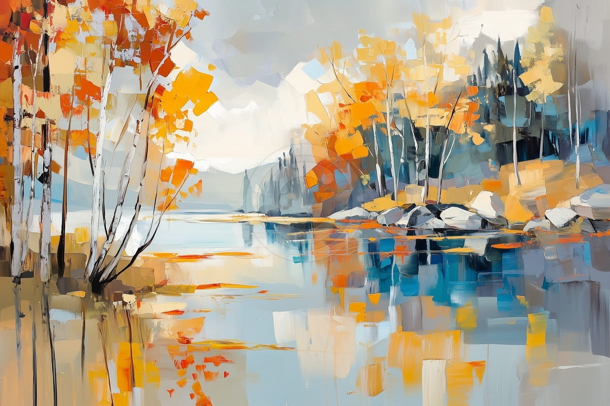 This impressionist painting beautifully captures the essence of autumn with its vibrant palette of warm oranges, golden yellows, and deep blues. The scene portrays a peaceful lakeside, where slender white-barked birch trees stand gracefully, their fiery foliage mirrored in the tranquil waters below. The textured brushstrokes convey a sense of movement, as if the gentle breeze rustles the leaves and the water ripples softly. Distant misty mountains fade into the horizon, adding a dreamlike depth to the composition. The interplay of light and shadow, combined with bold, expressive strokes, creates a mesmerizing harmony between nature and reflection, evoking a sense of nostalgia and tranquility.