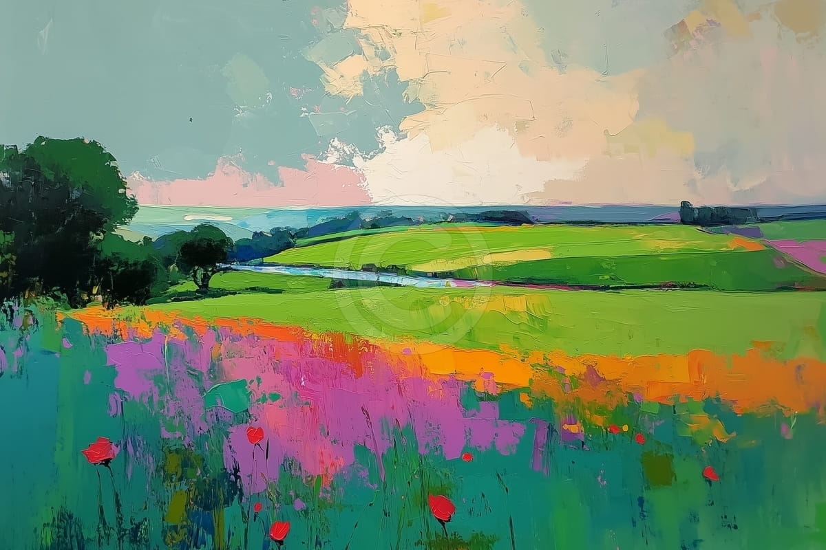 This impressionist landscape is full of bright colors and shows rolling countryside covered in light. Strong strokes of green, purple, orange, and yellow form a lively mix of wildflowers and open fields. The sky moves gently between blue and soft peach, suggesting a calm late afternoon. Trees appear along the horizon, adding contrast and a sense of distance. The rich mix of colors gives the scene a light and happy feeling. The painting shares warmth and a clear love for wild nature.