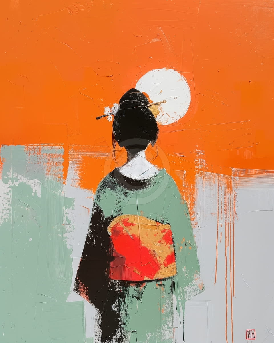 This minimalist artwork shows the elegance of traditional Japanese culture using a modern abstract style. A woman in a kimono stands with her back to the viewer, in front of a strong orange sky. The white sun creates a clear contrast and keeps the composition simple and calm. The small hair accessories and the bright red obi sash add detail and richness to the image, suggesting tradition and beauty. The textured brush marks give the painting a raw and expressive feeling. This artwork feels like a modern tribute to Japanese style and symbolism.