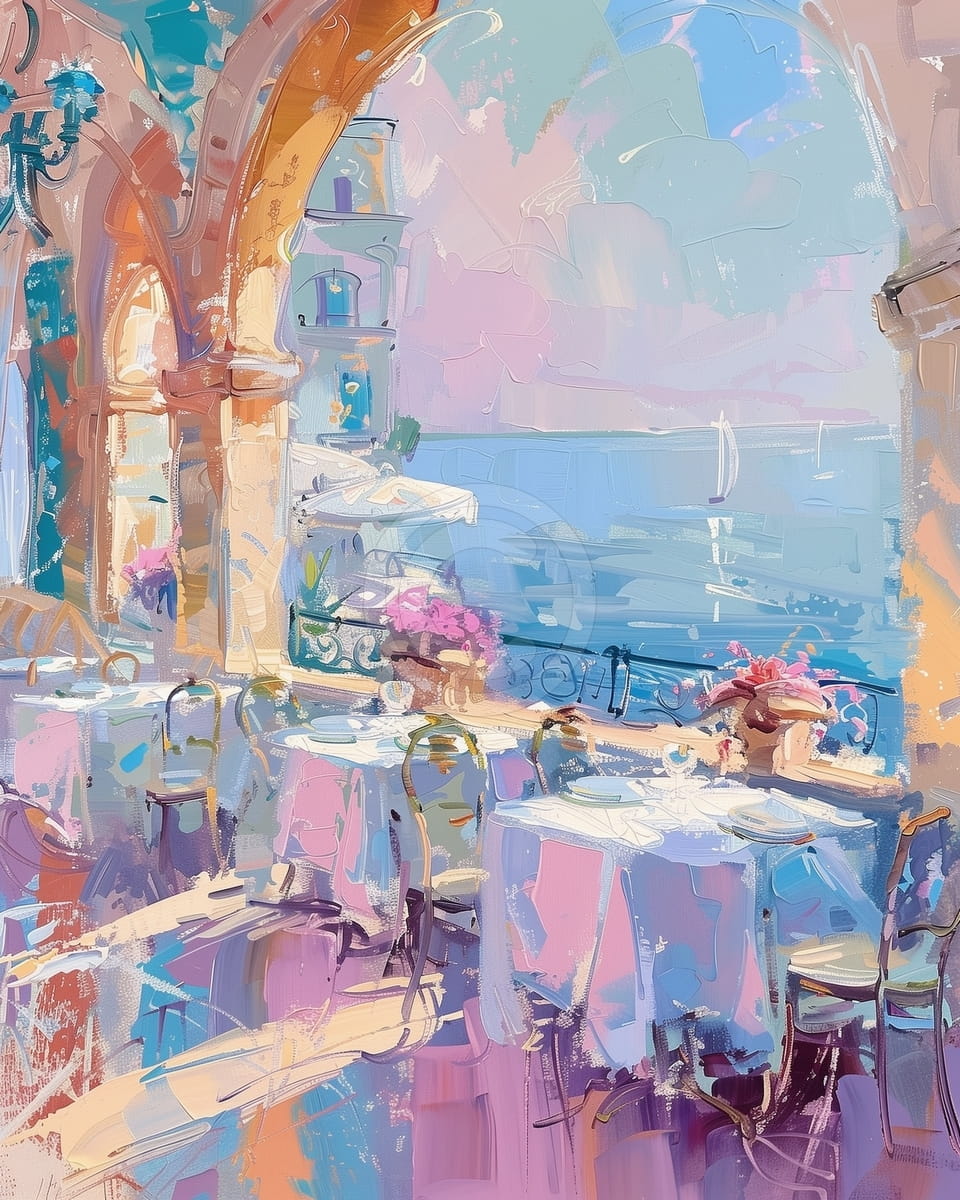 This painting shows a seaside terrace in Sorrento under warm sunlight, painted in soft pastel colors. The gentle brushstrokes and loose style give the scene a light and dreamy feeling. The tables are neatly set and look out over calm blue water. Arches around the terrace frame the view and create soft shadows that add depth. Bright flowers and the play of light bring warmth and color to the space. Overall, the image is a simple and beautiful view of life on the Italian coast.