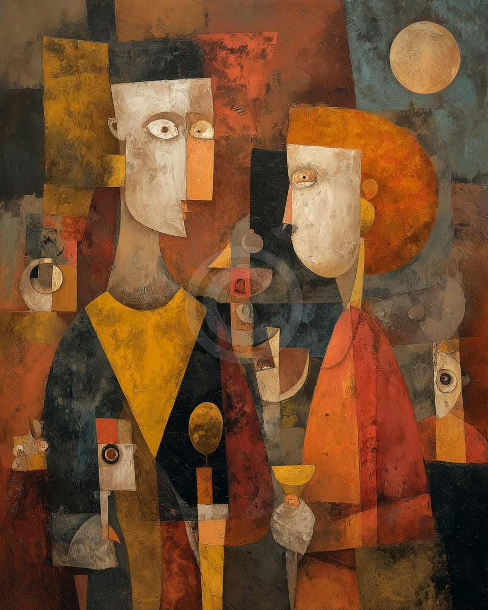 This cubist-style painting shows a refined couple drinking wine together in a strong geometric setting. The man and woman have long, simple features and expressive eyes, and their bodies are divided into sharp shapes and overlapping parts. Each holds a wine glass, suggesting a special moment or close connection. The artist uses warm colors like burnt orange, golden yellow, dark brown, and black, with small touches of teal and cream. A bright moon appears in the upper right corner, giving the scene a romantic night feeling. Thick layers of paint add depth and a rough texture to the surface. This artwork shows the joy of being together and sharing simple moments.