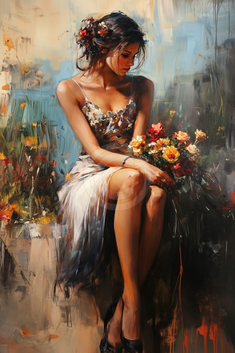 This painting shows a woman sitting calmly while holding a bouquet of roses, mixing realistic details with soft impressionist brushstrokes. Her posture is graceful and suggests a quiet moment of reflection. The light and shadow on her face highlight her delicate features, while the soft fabric of her flowing dress adds a sense of movement. Warm earth tones are balanced with cooler colors, creating a calm and harmonious atmosphere. Her downward gaze and relaxed pose give the image a thoughtful and peaceful feeling. Overall, the artwork shows beauty, emotion, and calm in a natural and simple way.
