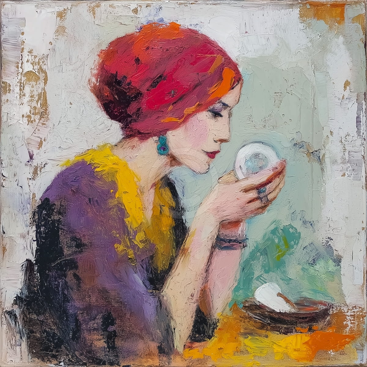 This painting shows a woman in profile wearing a detailed purple garment with yellow trim. She has a bright red turban or scarf on her head and large turquoise earrings. She carefully looks at a small round crystal object that she holds in her hands. The artist uses thick, heavy paint, creating a rough and rich surface. Strong and warm colors like red, purple, and yellow stand out in the front. The background is light and simple, which makes the figure more visible. The scene gives a feeling of mystery and quiet focus.