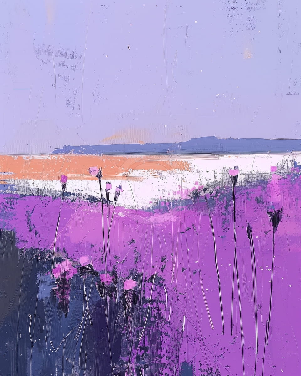Este paisaje minimalista moderno muestra una combinación relajante de lavanda, melocotón y azul profundo, creando una atmósfera tranquila pero expresiva. Las flores delicadas en primer plano contrastan con la suave gradación del cielo y las montañas lejanas. La composición transmite una sensación de calma y de espacio abierto. Los colores se ven suaves y bien equilibrados en toda la escena. La obra parece pacífica, elegante y relajante de observar.