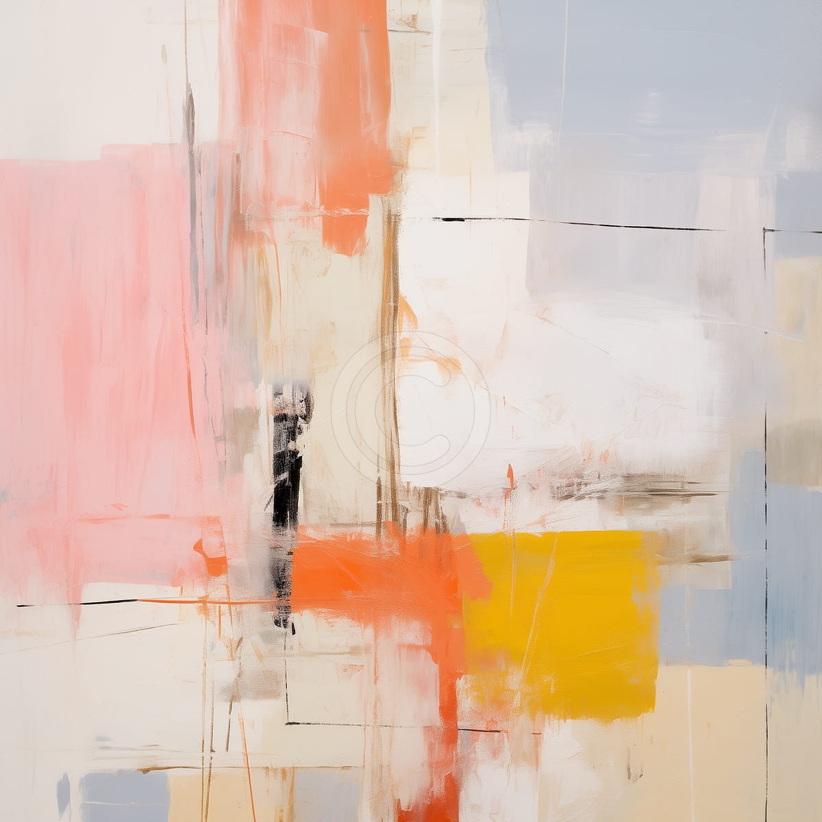 Esta pintura abstracta transmite calidez y equilibrio gracias a la combinación de tonos pastel suaves y detalles naranjas más vivos. Las pinceladas en capas unen color y textura de forma armoniosa, mientras que las líneas finas y las formas geométricas simples dan orden a la composición. Los tonos neutros de beige, gris y crema contrastan con los toques más intensos de naranja y amarillo, aportando luz y energía al conjunto. El aspecto general es limpio y moderno. Esta obra encaja bien en espacios contemporáneos y es una opción elegante y versátil para la decoración.