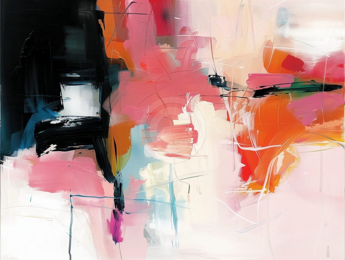 Este cuadro abstracto muestra rojo, negro y colores contrastantes de forma fuerte y viva. Las pinceladas y las formas fluidas dan sensación de energía y movimiento, mientras que el contraste entre tonos oscuros y brillantes crea profundidad y tensión. La mezcla de formas estructuradas y libres hace que la obra se sienta poderosa e intencional, invitando al espectador a percibir las emociones presentes en la escena.