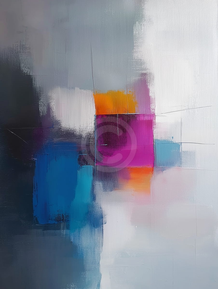 Este cuadro abstracto moderno une formas geométricas claras con cambios suaves de color, creando un equilibrio entre orden y libertad. Los azules profundos, los magentas vivos y los naranjas intensos destacan sobre los grises y blancos más suaves y claros. Las líneas definidas se mezclan con bordes difuminados, dando profundidad y movimiento a la imagen. La obra tiene un estilo elegante y actual, ideal como pieza decorativa que transmite creatividad y armonía.