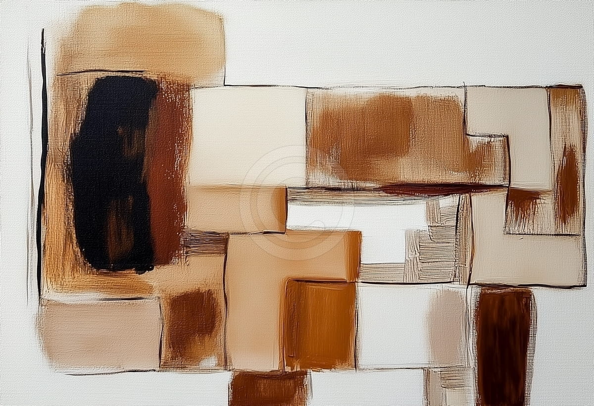 Este cuadro abstracto muestra rectángulos en tonos de beige, ocre, terracota y marrón oscuro. Las pinceladas con textura dan profundidad y movimiento, mientras que la disposición horizontal aporta equilibrio y estructura. La luz y la sombra crean sensación de volumen y tacto. Pequeñas variaciones de color y bordes suaves hacen que la imagen sea tranquila pero atractiva. La obra transmite calidez y estabilidad, adecuada para interiores modernos o rústicos.