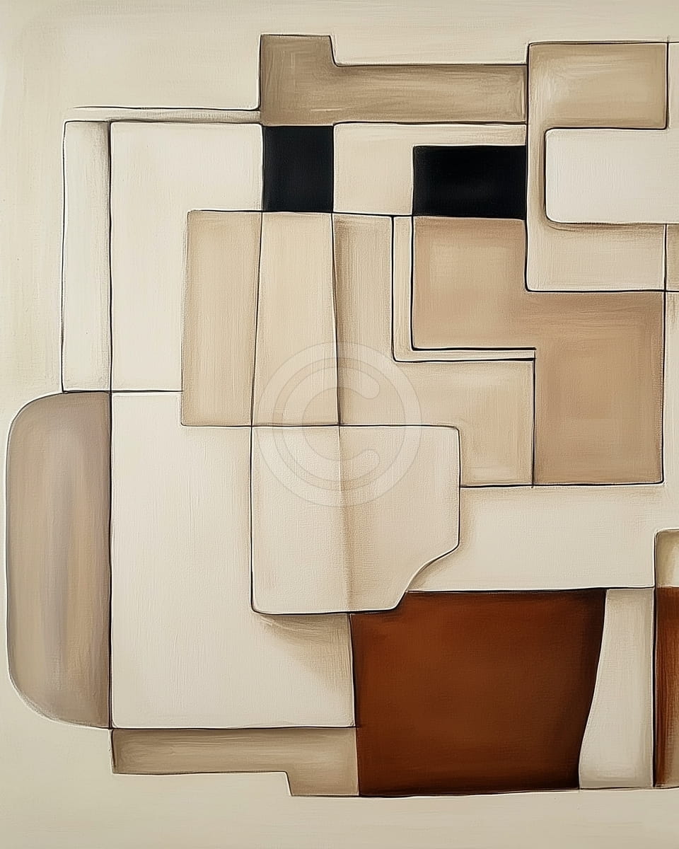 Esta pintura abstracta muestra bloques entrelazados y formas orgánicas en un esquema modular. Los tonos suaves de crema, beige, topo y marrón se combinan con segmentos negros, creando contraste y ritmo. Los bordes redondeados se mezclan con líneas más definidas, dando equilibrio visual. La composición parece arquitectónica, pero los suaves matices la suavizan. Una obra contemporánea y elegante, ideal para interiores minimalistas.