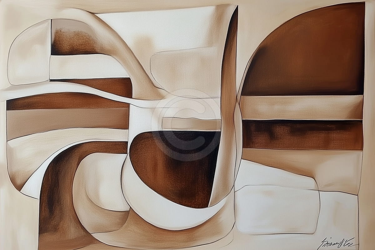 Esta obra abstracta muestra formas curvas y largas en marrones cálidos, beige claro y castaño oscuro. La composición contrasta áreas sólidas con espacios vacíos. La luz y la sombra hacen que las formas parezcan tridimensionales y dan sensación de movimiento. La mezcla de bordes rectos y redondeados añade elegancia natural. La pieza se ve tranquila y refinada, adecuada para habitaciones modernas y elegantes.