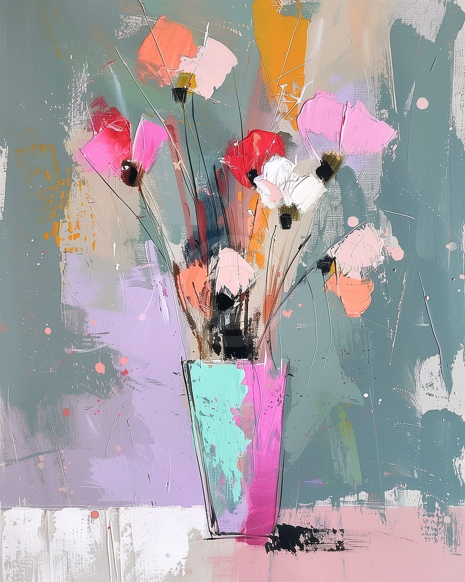 Este cuadro muestra un vibrante ramo de flores con pinceladas audaces y una paleta de colores dinámica. Los pétalos delicados en rosa, rojo, blanco y melocotón destacan sobre el fondo verde suave y difuminado, aportando profundidad y energía a la composición. La textura de la pintura, junto con salpicaduras expresivas y detalles espontáneos, da como resultado una elegante composición floral, ideal para cualquier espacio moderno.