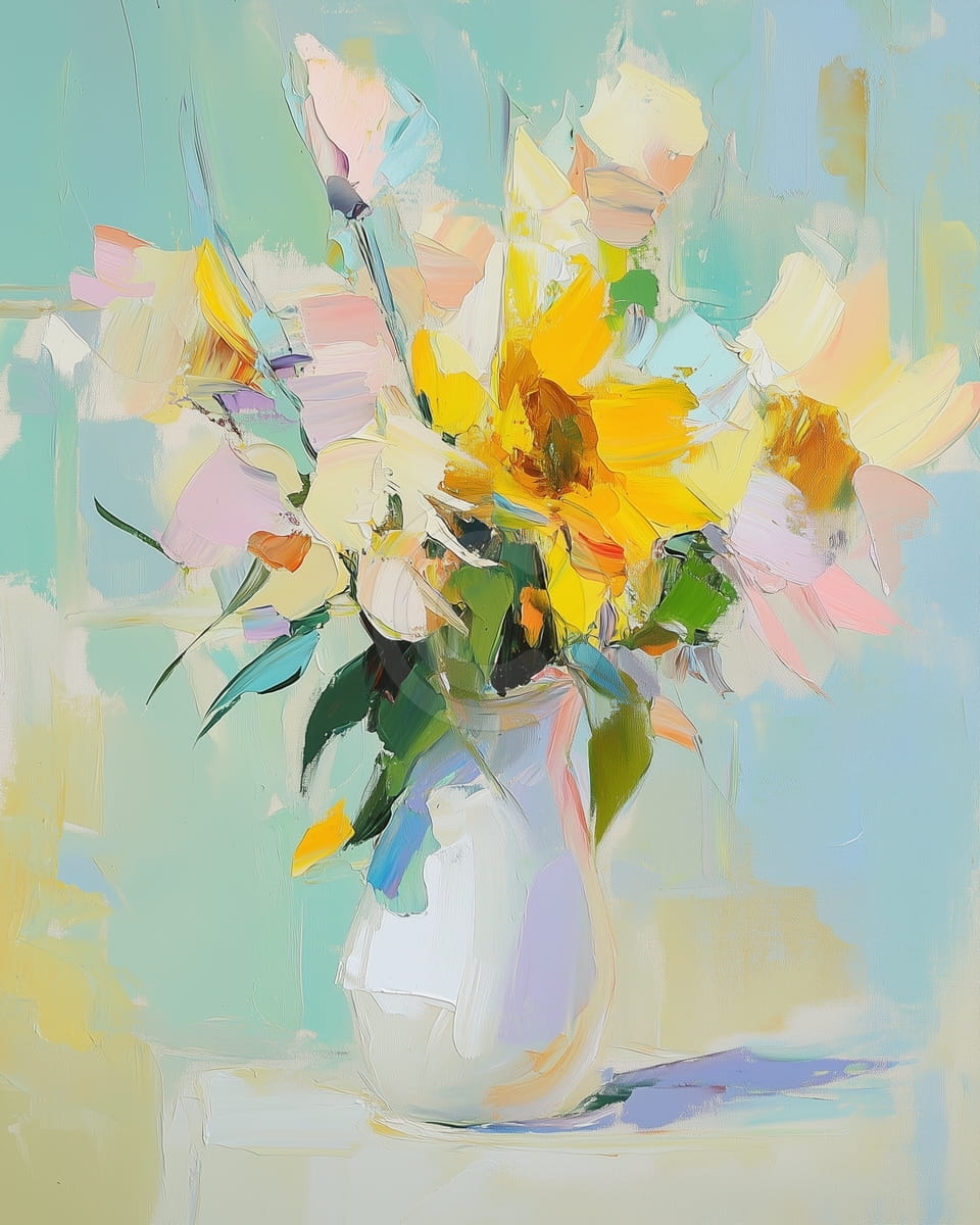 Este cuadro impresionista muestra un ramo de girasoles y flores en tonos pastel en un sencillo jarrón blanco. Las pinceladas fluidas y los colores suaves—amarillos, rosas y azules—crean una atmósfera ligera y soñadora. El juego de luces y sombras da un toque etéreo a la obra. El cuadro transmite calma y calidez, siendo perfecto para interiores serenos y elegantes.