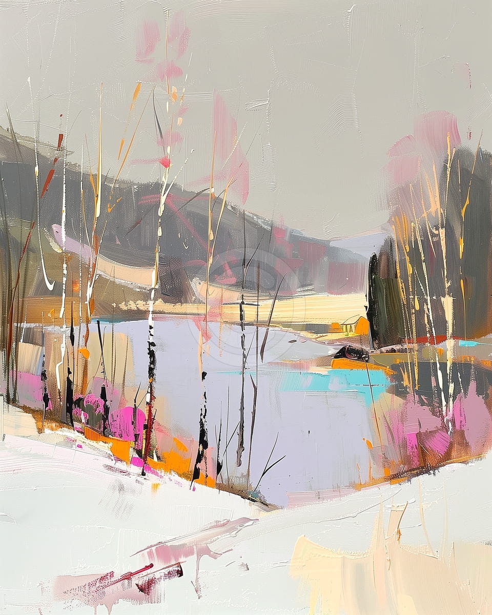 Este paisaje muestra una escena serena pero animada, con un lago tranquilo que refleja las montañas y los árboles delicados. Las pinceladas expresivas y la paleta suave de grises apagados, tonos cálidos terrosos y toques de rosa y naranja crean profundidad y movimiento. El primer plano nevado contrasta con el cálido resplandor de la cabaña lejana, realzando la atmósfera onírica y envolvente de la escena.