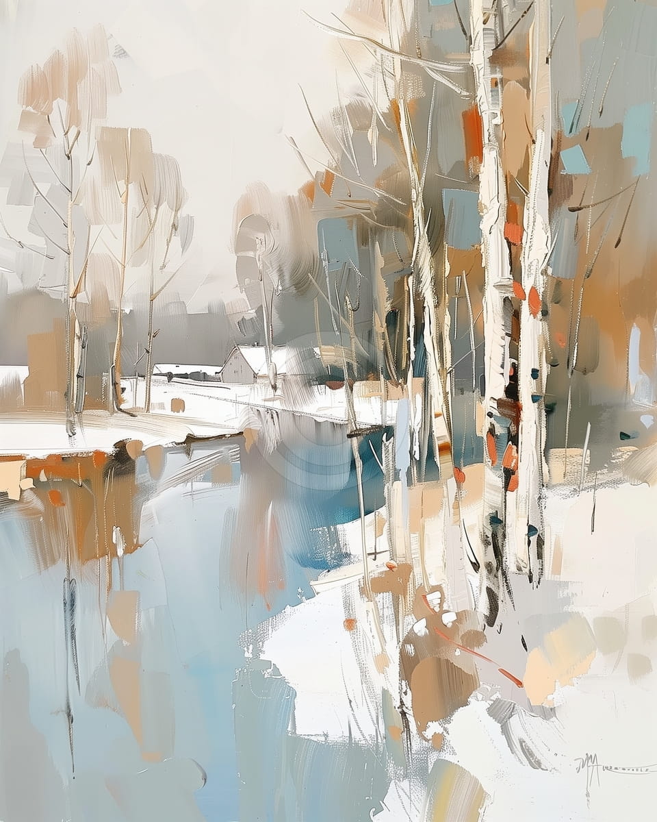 Este cuadro muestra un paisaje invernal tranquilo, con una pequeña cabaña entre altos abedules junto a un río helado. Los tonos suaves de blanco, beige y azul crean una atmósfera serena y casi etérea. Las pinceladas expresivas sugieren el movimiento del viento entre las ramas desnudas. La escena transmite tanto el aire frío del invierno como la cálida soledad de un refugio escondido en el bosque.