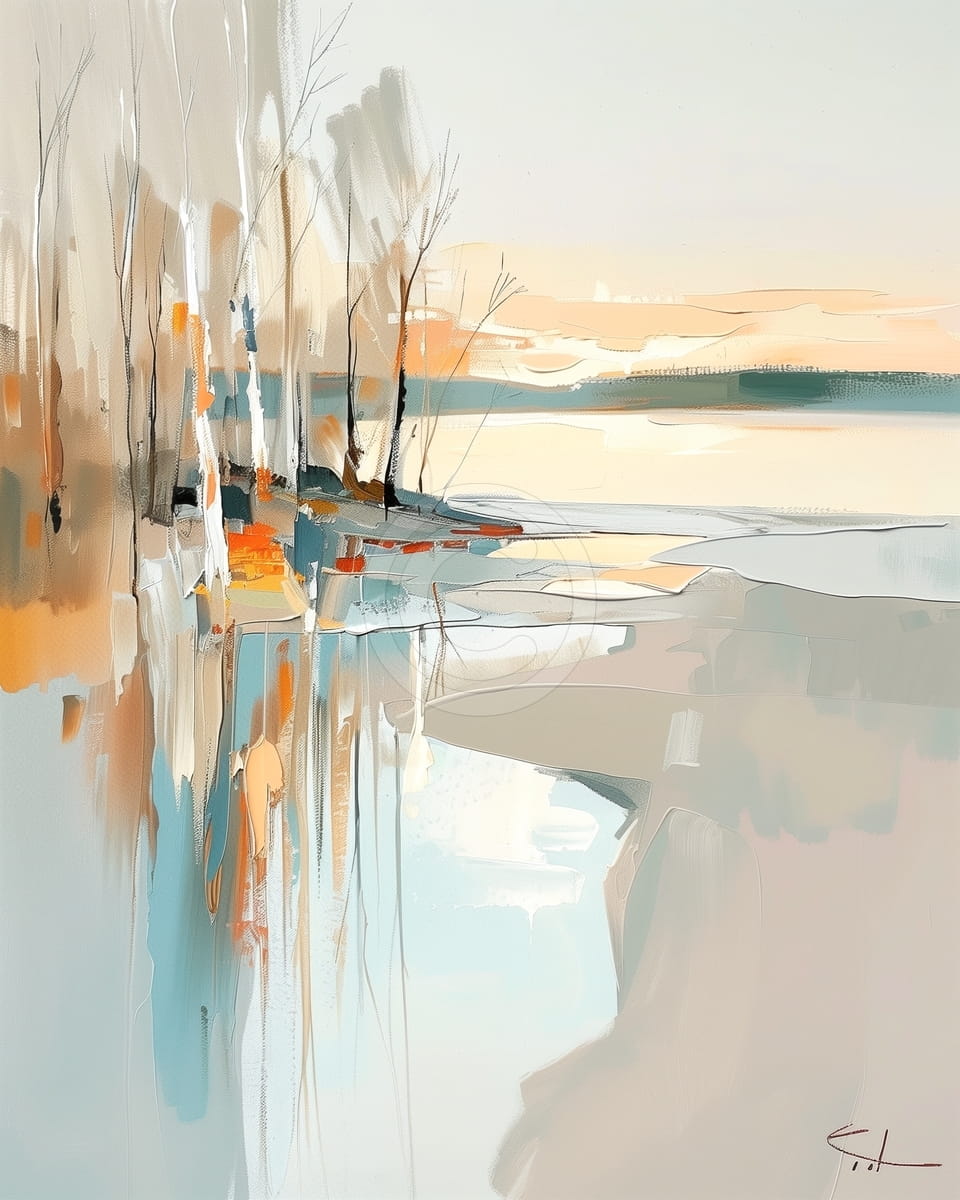 Este cuadro abstracto muestra una escena tranquila junto al río, con esbeltos abedules que se elevan con gracia en la orilla. Sus ramas delicadas se extienden hacia el cielo, fusionándose con un fondo suave de tonos cálidos y fríos. Los reflejos en el agua añaden profundidad y serenidad a la escena. Las pinceladas suaves y los sutiles contrastes de luz y sombra crean una armonía pacífica, capturando la calma belleza de la naturaleza y el cambio de las estaciones.
