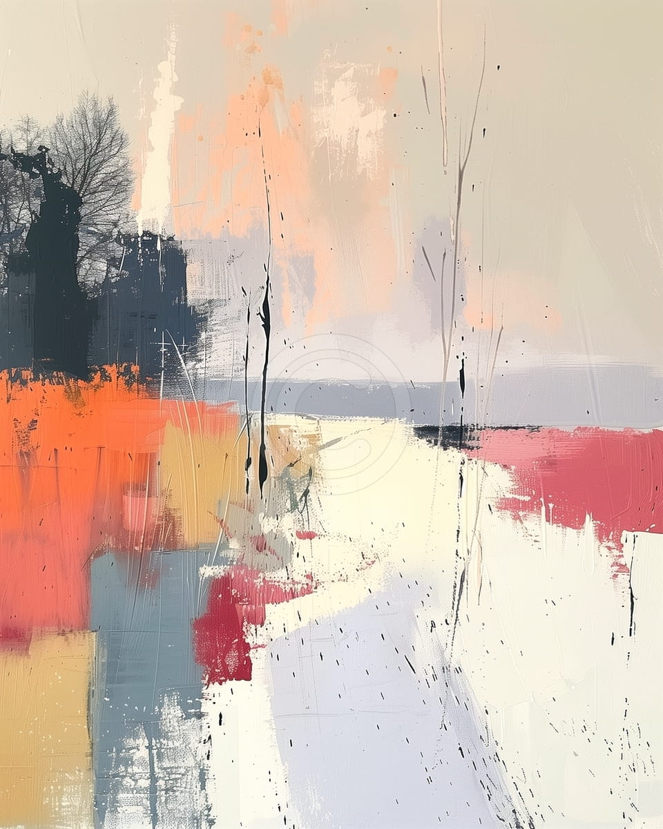 Este cuadro abstracto al aire libre muestra la sensación de pintar en exterior con pinceladas libres y espontáneas. Los tonos cálidos de naranja y rojo contrastan con neutros suaves y grises fríos, mostrando la luz que cambia en un paisaje brillante y tranquilo. Los árboles simples y las texturas suaves añaden profundidad y una ligera sensación de movimiento. La línea del horizonte invita al espectador a un espacio tranquilo y suave. El cuadro mezcla energía y calma, mostrando la belleza natural de un momento en un estilo moderno y dinámico.