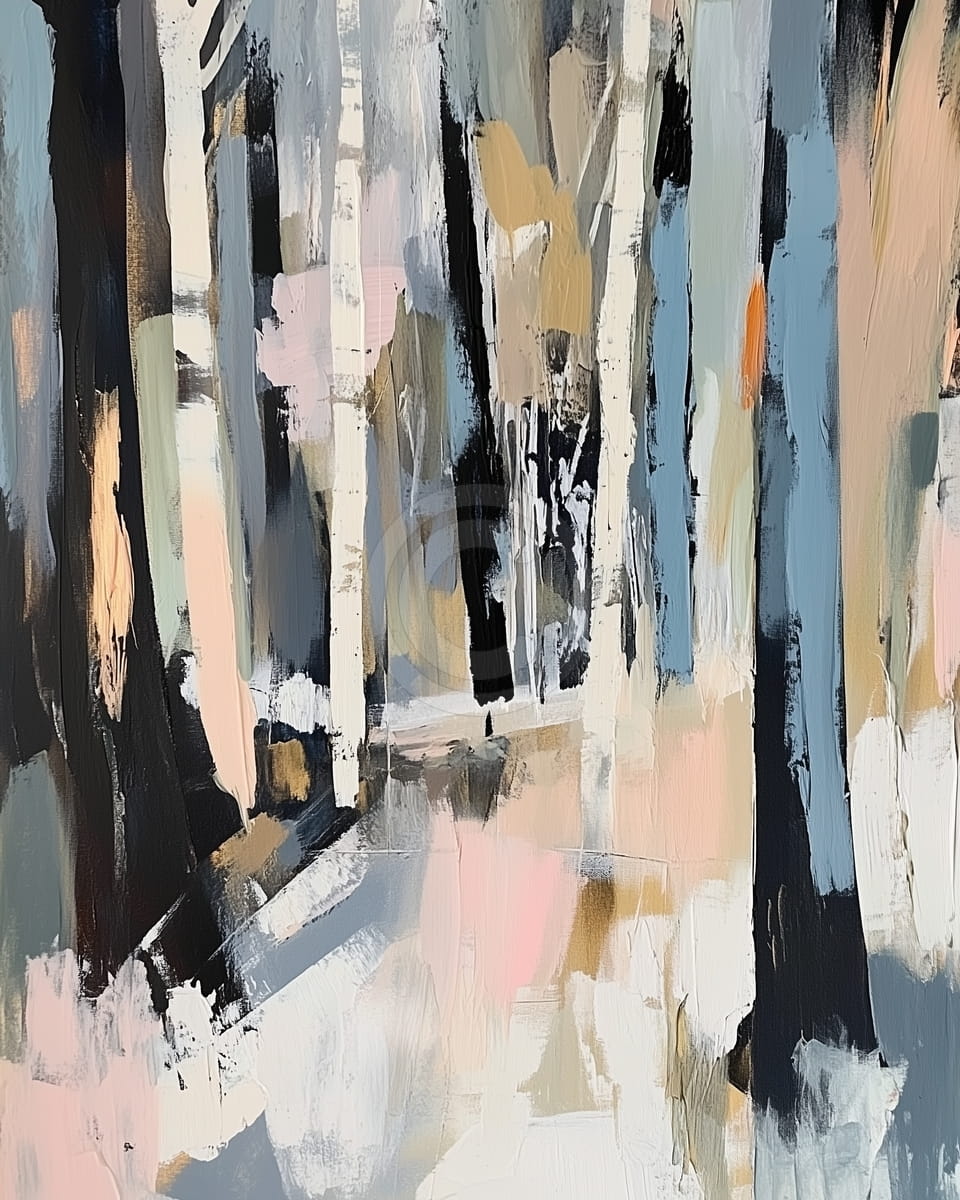 Este cuadro ofrece una visión abstracta y envolvente de un bosque, donde las pinceladas libres y la gama cromática suave construyen una atmósfera llena de profundidad. Los troncos verticales aportan ritmo y firmeza, mientras el fondo fluido sugiere movimiento y ligereza, creando un equilibrio entre orden y espontaneidad. Matices de rosa pastel, ocres cálidos y azules fríos se integran con sutileza, aportando luminosidad y una sensación casi etérea. La luz y la sombra se entrelazan sobre la superficie texturizada, generando una vibración delicada que da vida al conjunto. La composición invita a una contemplación pausada, más emocional que descriptiva. Así, el bosque se transforma en una experiencia sensorial que evoca calma, memoria y ensoñación.