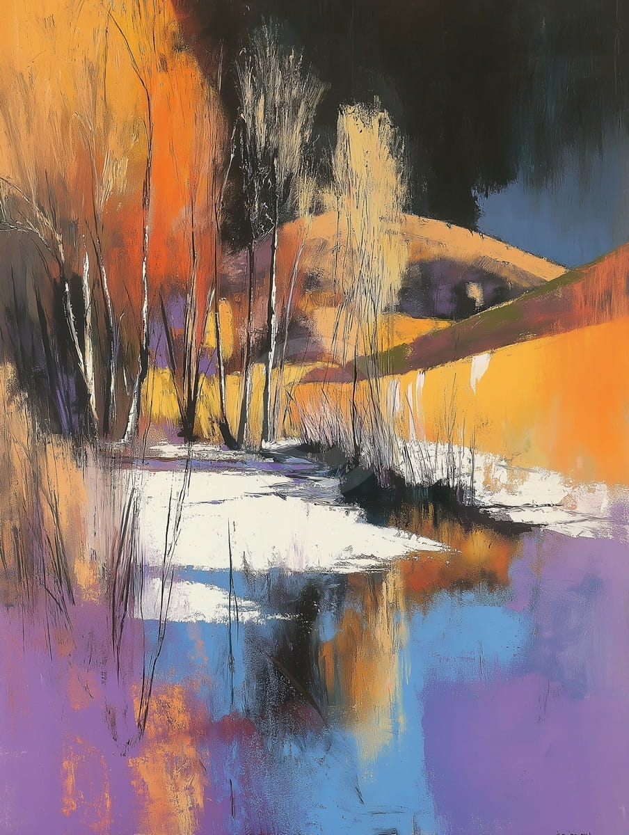 Este cuadro representa un lugar mágico donde los colores otoñales se mezclan perfectamente con los reflejos frescos de un arroyo tranquilo. Los cálidos tonos dorados de los árboles y colinas contrastan maravillosamente con los azules profundos y morados del agua, creando una armonía hipnotizante. Las pinceladas expresivas del artista otorgan a la escena una cualidad onírica, casi surrealista, como si invitaran al espectador a un mundo místico. El juego de luz y sombra realza aún más la atmósfera etérea, haciendo de este un lugar tanto pacífico como encantador.