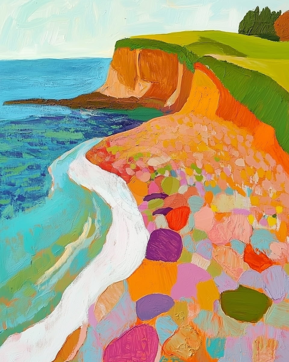 Un cuadro costero alegre y abstracto donde colores vivos dan forma a la costa, el mar y los acantilados. El agua turquesa se curva alrededor de una playa clara y con textura, llena de piedras redondas en tonos morado, naranja, verde y rosa. Los acantilados suben en naranjas intensos, con campos verdes arriba y árboles a lo lejos. Las pinceladas libres y visibles dan ritmo y una sensación de alegría. El equilibrio entre mar y tierra se siente ligero pero bien logrado. La obra transmite calidez y energía creativa.