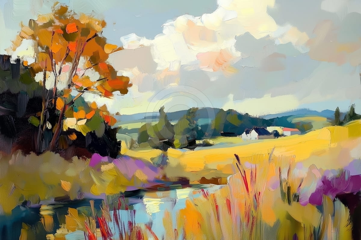 ARTE DE PARED EXCLUSIVA: Paisaje Otoñal Con Casas De Campo A Lo Lejos es un cuadro único, creado exclusivamente por PastelBrush y disponible únicamente en esta galería. No forma parte de las colecciones de otras tiendas de cuadros, lo que le confiere un carácter auténtico y exclusivo. Esta singularidad lo convierte en una elección ideal para quienes buscan obras originales y distintivas, no producidas en serie.