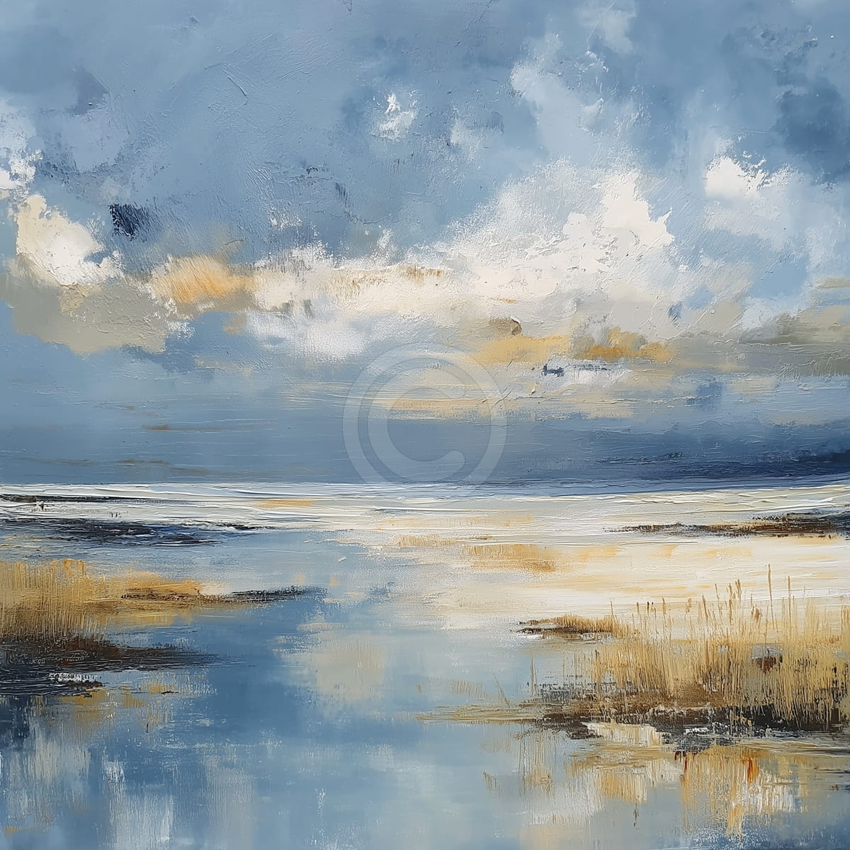 Tonos suaves de azul, crema y dorado claro se extienden por una orilla tranquila, donde el cielo y el agua se reflejan de forma simple y calmada. Pinceladas amplias y visibles muestran las nubes que pasan y el brillo ligero del agua baja, creando una sensacion de espacio abierto y paz. La escena parece tranquila pero viva, mostrando la naturaleza en un momento sencillo entre quietud y movimiento suave.