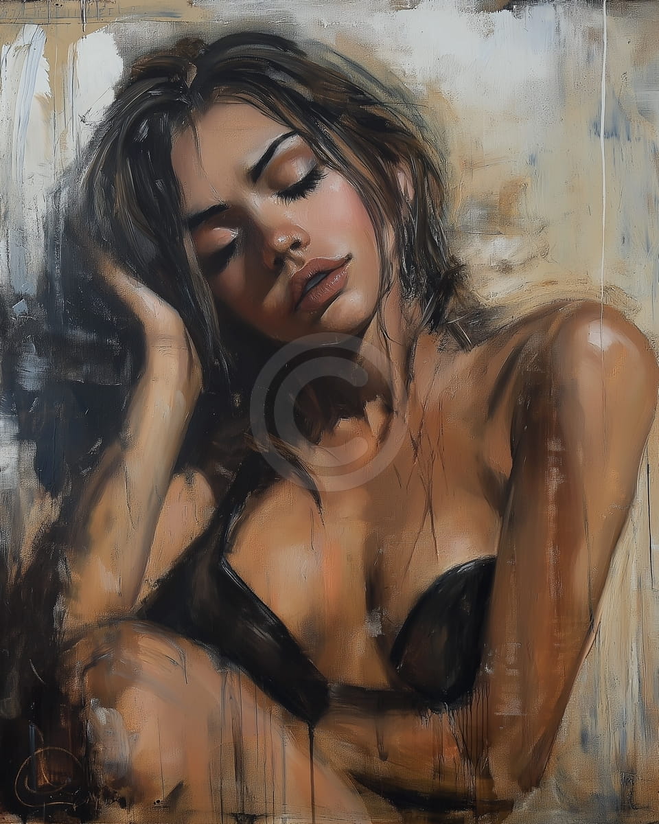 Este cuadro muestra un momento de sensualidad tranquila y reflexion, combinando detalles realistas con pinceladas libres y visibles. Los rasgos suaves de la mujer, sus labios ligeramente abiertos y sus ojos cerrados crean una sensacion de calma y emocion profunda. Los tonos calidos y terrosos, junto con una luz suave, resaltan su apariencia natural, mientras el fondo con textura crea contraste y una atmosfera mas intima. Las pinceladas son sueltas, sobre todo en los bordes, lo que aumenta la expresividad y hace que la imagen se sienta delicada pero tambien fuerte. Esta pintura resalta la feminidad, la vulnerabilidad y una confianza tranquila.