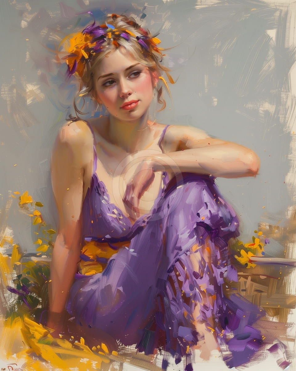 Este cuadro muestra calidez y una belleza delicada y presenta a una joven en una luz suave, con una corona de flores amarillas y violetas. Su mirada pensativa y su postura relajada sugieren un momento tranquilo de reflexion. Las pinceladas fluidas y el estilo impresionista dan a la obra una sensacion ligera y aireada. La mezcla de tonos dorados calidos y lavanda fria crea un contraste claro y agradable. La tecnica suelta y expresiva hace que la imagen se sienta viva y un poco sonadora. La escena sugiere una conexion natural entre la naturaleza y la elegancia femenina.