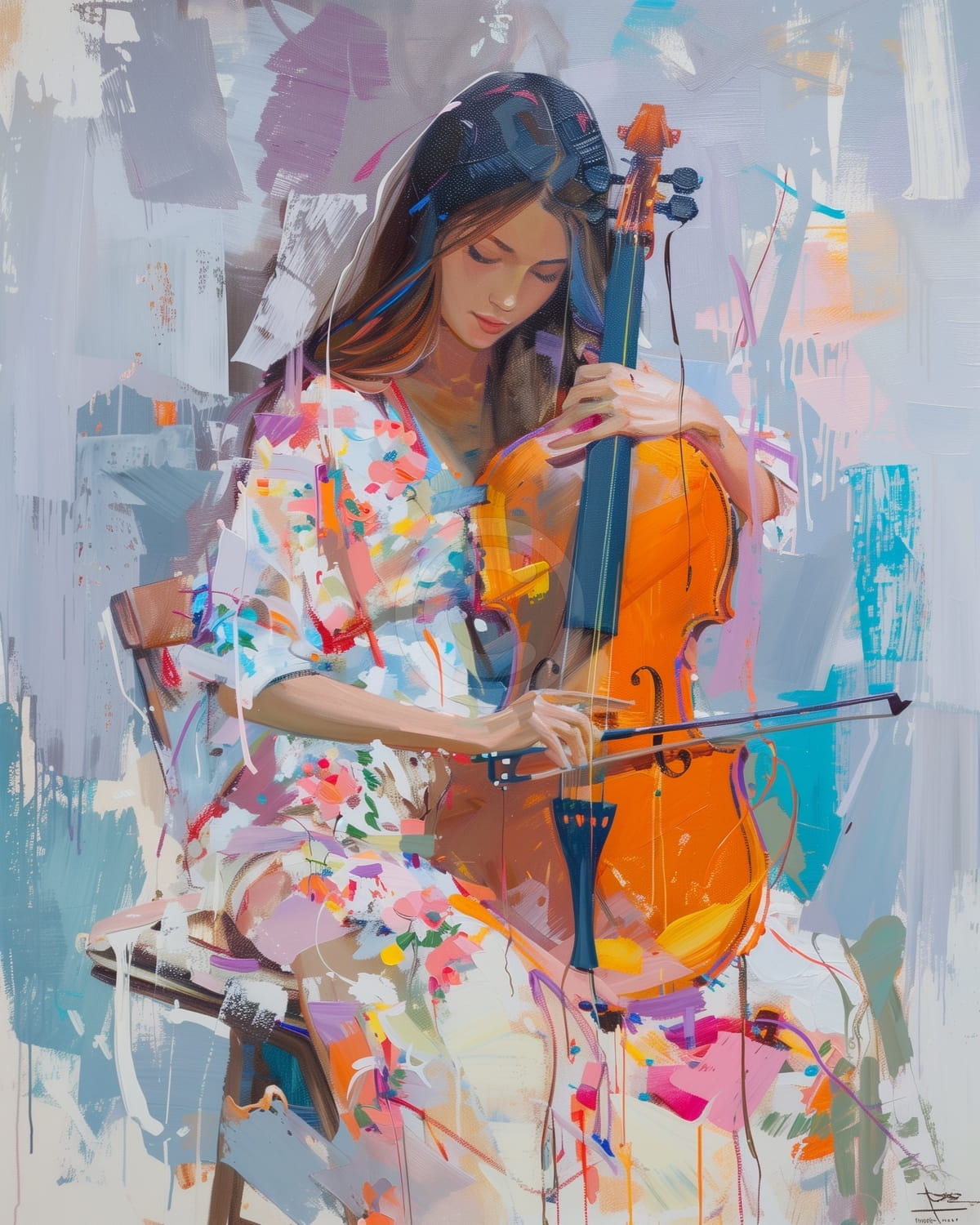 Este hermoso cuadro muestra a una mujer totalmente concentrada en tocar el contrabajo. Su rostro tranquilo refleja una conexión profunda con la música. Lleva un vestido floral fluido que le da gracia y elegancia, mientras que el naranja vivo del instrumento resalta sobre el fondo pastel. Las pinceladas visibles y las pequeñas salpicaduras de color añaden movimiento y energía, mezclando detalles realistas con un estilo ligeramente impresionista, haciendo que la obra sea emotiva y atractiva visualmente.