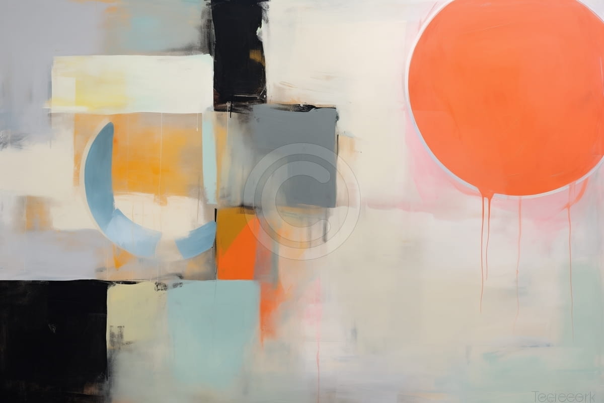 Ce tableau abstrait, Le Cosmos, montre une composition inspirée de l’univers qui combine formes géométriques et transitions de couleur plus fluides. Une sphère orange intense, semblable à un soleil ou une planète, domine le côté droit, avec des contours adoucis par de légères coulures de peinture. À gauche, une forme de croissant en bleu froid évoque la lune et crée un contraste avec les tons dorés plus chauds et les zones texturées en noir et gris. La combinaison entre blocs plus structurés et transitions douces suggère l’immensité de l’espace. L’ensemble équilibre désordre et harmonie, créant une atmosphère cosmique et légère.