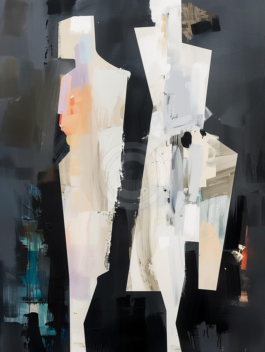 Ce tableau montre une image abstraite de silhouettes humaines faites avec des formes géométriques et un fort contraste entre couleurs claires et foncées. La composition en parties et les coups de pinceau visibles donnent une impression de profondeur et de mouvement. Les couleurs simples, comme le beige, le noir et le blanc, rendent les figures plus discrètes et un peu mystérieuses. Le lien entre les formes pleines et les espaces vides invite le spectateur à regarder l’équilibre entre ce qui est présent et ce qui ne l’est pas. La manière dont les silhouettes sont placées donne à l’œuvre un style moderne et intéressant.