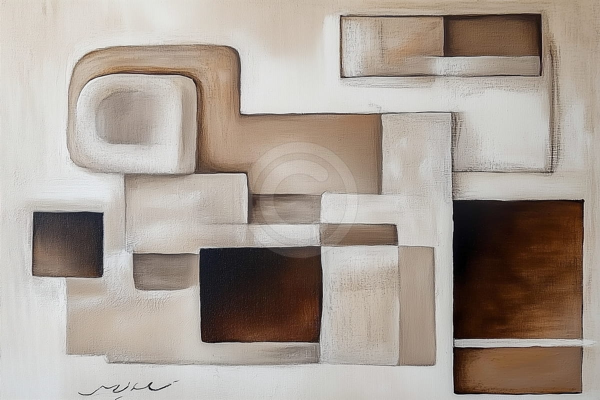 Ce tableau abstrait montre des rectangles et des carrés aux bords doux en beige, crème, brun et noir. Les surfaces lisses et légèrement texturées rendent l’image intéressante, et les formes sont placées avec soin pour créer une structure calme et équilibrée. Les éléments arrondis contrastent doucement avec les angles, apportant un léger mouvement. Les couleurs chaudes donnent une impression de confort et de stabilité. Idéal pour des intérieurs modernes et tranquilles.