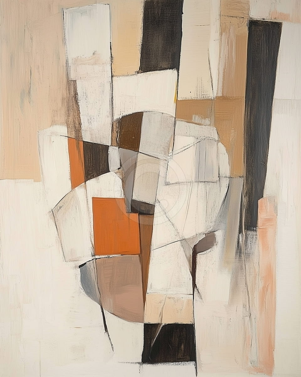 Ce tableau abstrait montre des formes géométriques irrégulières disposées en vertical. Les couleurs sont terre cuite, beige, ivoire, gris chaud et brun foncé, avec des touches d’orange vif. Les formes s’emboîtent comme des pièces de puzzle, créant équilibre et lien. Les coups de pinceau épais donnent texture, énergie et profondeur. La composition semble structurée mais expressive. C’est une option simple et forte pour décorer des pièces modernes et créatives.